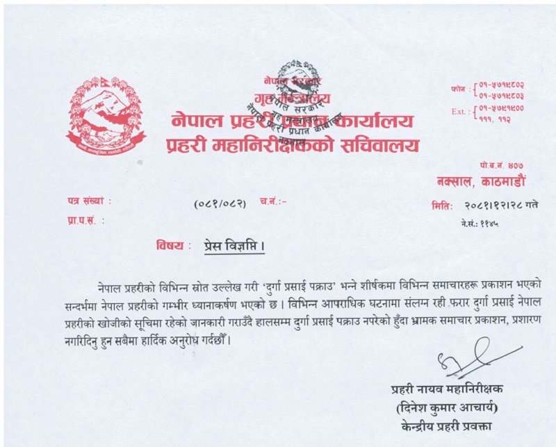 प्रहरी प्रधान कार्यालयले ‘हालसम्म प्रसाईं पक्राउ नपरेको’ जनाएको छ । नेपाल प्रहरीका प्रवक्ता (डीआईजी) दिनेशकुमार आचार्यले गएराति निकालेको विज्ञप्तिमा उल्लेख छ, ‘विभिन्न आपराधिक घटनामा संलग्न रही फरार दुर्गा प्रसाईं नेपाल प्रहरीको खोजीको सूचीमा रहेको जानकारी गराउँदै हालसम्म प्रसाईं पक्राउ नपरेको हुँदा भ्रामक समाचार प्रकाशन, प्रसारण नगरिदिनुहुन अनुरोध गर्दछौँ ।’