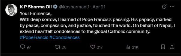 सामाजिक सञ्जाल एक्समा उनले उक्त हमलामा परी ज्यान गुमाएकाहरूप्रति गहिरो समवेदना व्यक्त गरेका हुन् । “दुःखको यो घडीमा नेपाल सरकार भारत सरकारका साथ दृढतापूर्वक ऐक्यबद्धता जनाउँछ र सबै किसिमका आतङ्कवादी कार्यहरूको कडा निन्दा गर्दछ।”