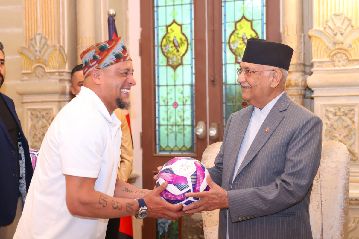 काठमाडौं । काठमाडौंमा जारी नेपाल सुपर लिग २०२५ को अवसरमा नेपाल भ्रमणमा आएका लेजेण्ड ब्राजिलियन फुटबलर रोबर्टो कार्लोसले प्रधानमन्त्री केपी शर्मा ओलीलाई भेटवार्ता गरेका छन् ।
