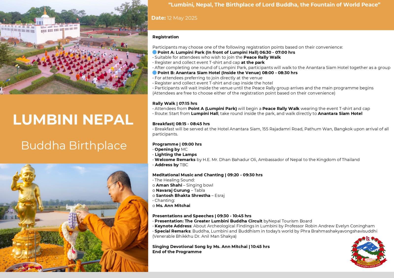 काठमाडौं । बुद्ध जयन्तीको अवसरमा (मे १२ तारिख) नेपाली दूताबास थाइल्याण्डको आयोजना र गैर नेपाली आवासीय संघ थाइल्याण्डको समर्थनमा बैंककमा विशेष कार्यक्रम आयोजना गरिएको छ । “लुम्बिनी, नेपाल भगवान बुद्धको जन्मस्थल, विश्व शान्तिको मुहान“ भन्ने नाराका साथ लुम्बिनीलाई विश्वभर चिनाउने उद्देश्यका साथ कार्यक्रम आयोजना गरिएको हो ।