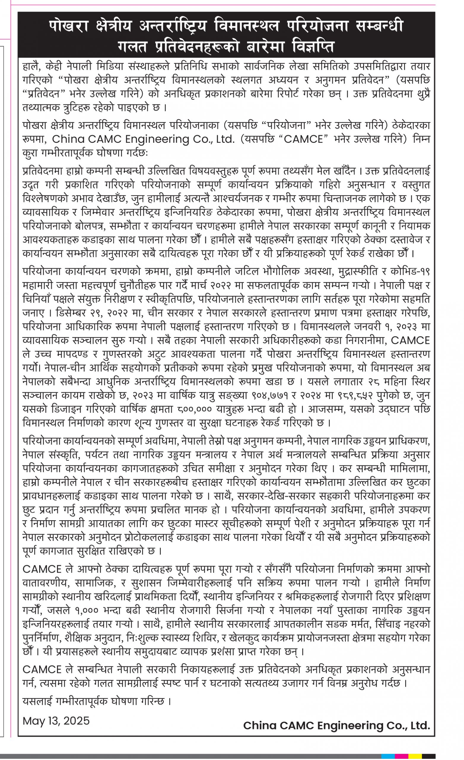 पोखरा विमानस्थलमा लेखा उसमितिको छानविनमा चिनियाँ कम्पनीको आपत्ति (विज्ञप्तिसहित)