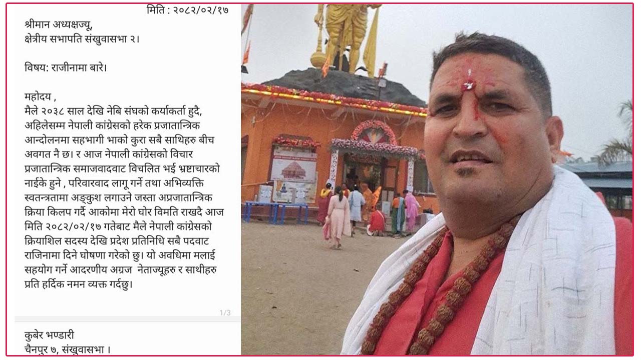 नेता भण्डारी राजीनामा पत्रमा लेख्छन्, “आज मिति २०८२\०२\१७ गतेबाट मैले नेपाली कांग्रेसको क्रियाशील सदस्यदेखि प्रदेश प्रतिनिधि सबै पदवाट राजिनामा दिने घोषणा गरेको छु ।”