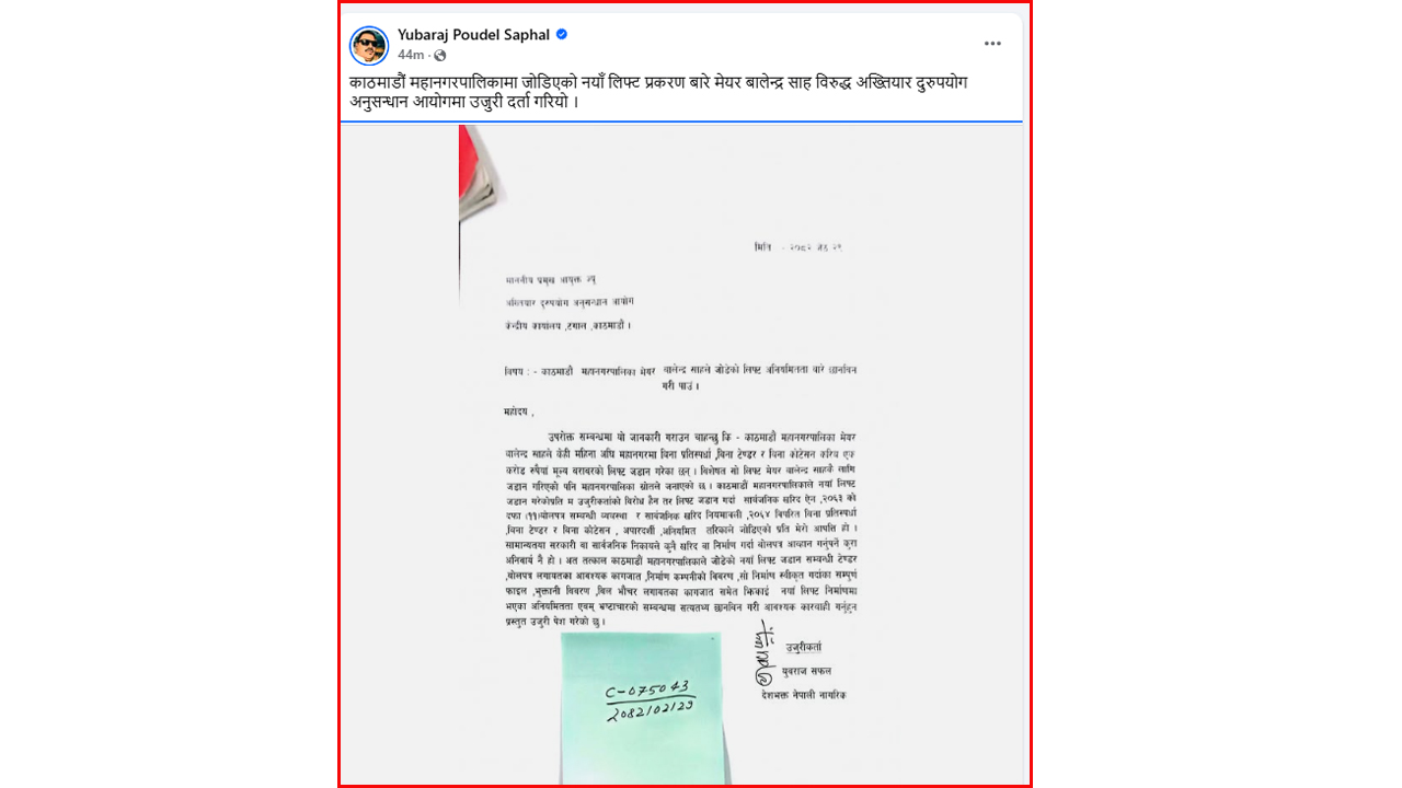 मेयर शाहले महानगरमा जडान गरेको लिफ्टमा अनियमतिता भएको र यसविषयमा छानबिन गरी पाउँ भन्दै अख्तियारमा मुद्धा दायर गरेको उनले सामाजिक सञ्जाल फेसबुक मार्पmत जानकारी दिएका छन् ।