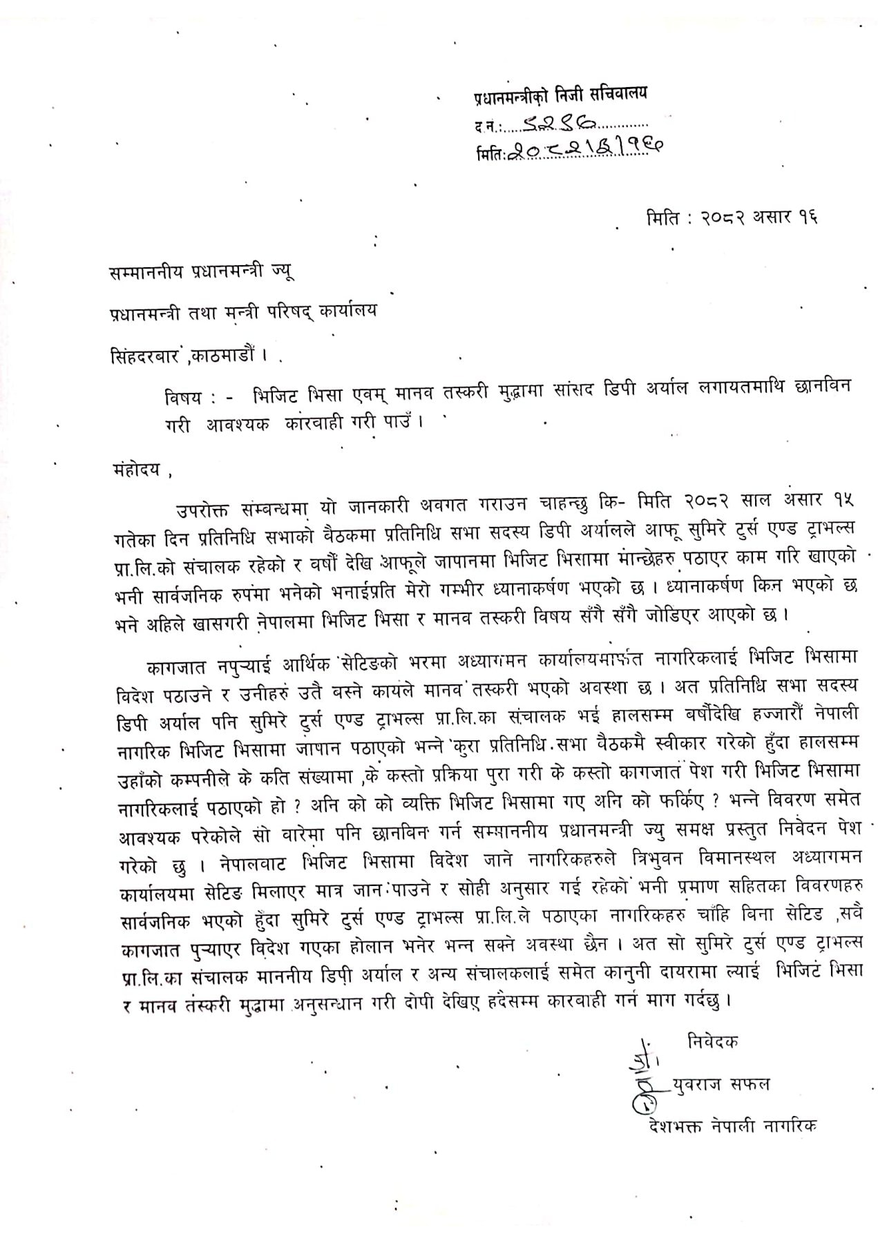 सुमिरे टुर्स एण्ड ट्राभल्सका सञ्चालक समेत रहेका रास्वपाका कार्यवाहक सभापतिको गतिविधिमाथि छानबिन माग गर्दै भ्रष्टाचारविरोधी अभियन्ता बताउँदै आएका युवराज सफल (पौडेल)ले उजुरी दर्ता गराएका हुन् ।