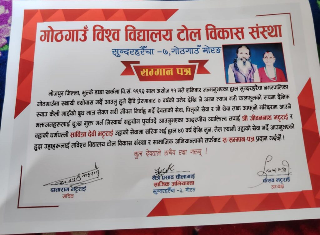यही असार २२ गते शनिबार टोल विकास संस्थाका पदाधिकारीहरूले वृद्ध आमाबुवाको घरघरमा पुगेर आत्मीय भेटघाट गर्यो । यसैगरी पदाधिकारीहरुले स्वास्थ्य अवस्थाबारे जानकारी लिए। सोही कार्यक्रमको अवसरमा टोल विकासले स्थानीय व्यक्तित्व जीवननाथ भट्टराई र वहाँकी धर्मपत्नी सावित्रा देवी भट्टराईलाई सम्मान गरेको छ । हाल सुन्दरहरैचा नगरपालिका गोठगाउँमा स्थायी वसोवास गर्दै आउनु भएका जीवनाथ भट्टराई दैवी प्रेरणाबाट ७ वर्षको उमेरदेखि नै अन्न त्याग गरी फलफुलको रूपमा दैनिक स्याउ, कैली गाईको दुध मात्र सेवन गरी जीवन निर्वाह गर्दै आउनु भएको छ।