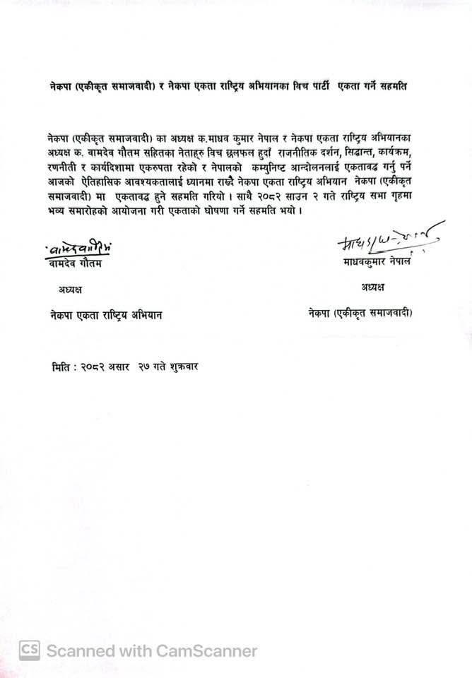 पार्टी एकता आउँदो साउन २ गते राष्ट्रिय सभा गृहमा एक समारोहका बीच एकताको घोषणा गर्ने सहमति भएको दुई नेताद्वारा हस्ताक्षरित सहमति पत्रमा उल्लेख छ ।
