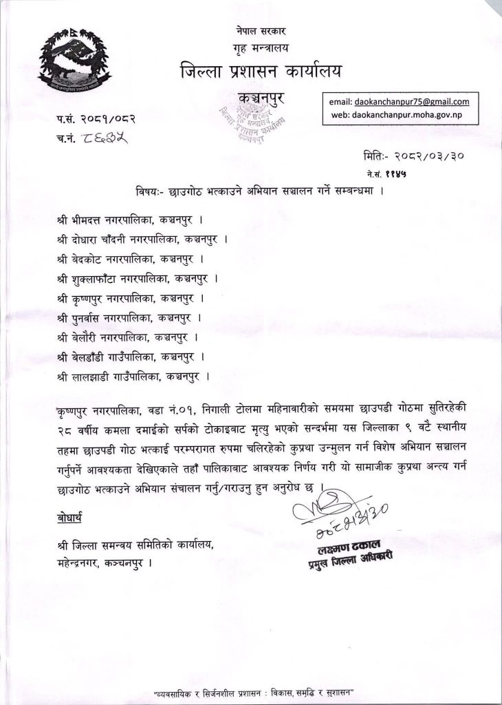 प्रमुख जिल्ला अधिकारी ढकालले जारी गरेको पत्रमा भनिएको छ, ‘कृष्णपुर नगरपालिका–१ की कमला आउजीको छाउगोठमा सुतिरहेको अवस्थामा सर्पले टोकेर मृत्यु भएको सन्दर्भमा यस जिल्लाका ९ वटै स्थानीय तहमा रहेका छाउगोठ हटाएर परम्परागत रूपमा रहेको कुप्रथा हटाउन आवश्यक देखिएकाले पालिकाबाट आवश्यक निर्णय गरी उक्त सामाजिक कुप्रथा अन्त्य गर्न छाउगोठ भत्काउने अभियान सञ्चालन गर्न गराउन अनुरोध छ।’