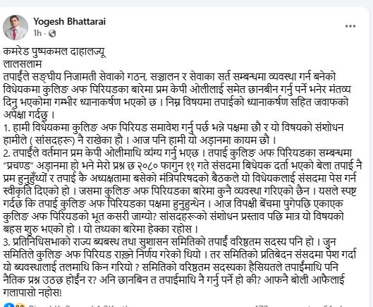 उसोतः योगेशले भनेका छन्, ‘तपाईंले वर्तमान प्रम केपी ओलीमाथि व्यंग्य गर्नु भएछ । तपाई कुलिङ अफ पिरियडका सम्बन्धमा “प्रचण्ड” अड़ानमा हो भने मेरो प्रश्न छ २०८० फागुन ११ गते संसदमा बिधेयक दर्ता भएको बेला तपाई नै प्रम हुनुहुँथ्यों र तपाई कै अध्यक्षतामा बसेको मंत्रिपरिषदको बैठकले यो विधेयकलाई संसदमा पेस गर्न स्वीकृति दिएको हो । जसमा कुलिङ अफ पिरियडका बारेमा कुनै व्यवस्था गरिएको छैन । यसले स्पष्ट गर्दछ कि तपाई कुलिङ अफ पिरियडका पक्षमा हुनुहुन्थेन । आज विपक्षी बेंचमा पुगेपछि एकाएक कुलिङ अफ पिरियडको भूत कसरी जाग्यो? सांसदहरूको संशोधन प्रस्ताव पछि मात्र यो विषयको बहस शुरु भएको हो । यो तथ्यका बारेमा हेक्का रहोस ।’