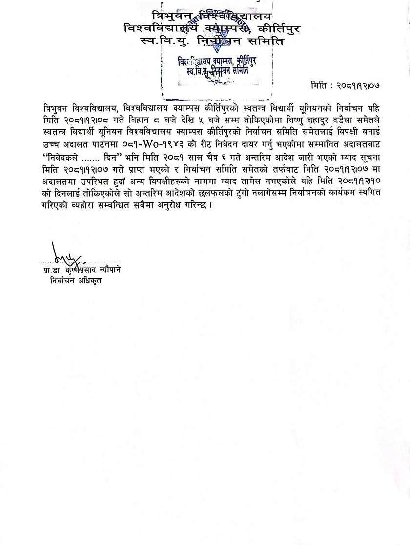 स्ववियु निर्वाचन समितिले एक सूचना जारी गर्दै स्ववियु निर्वाचनको कार्यक्रम स्थगित भएको जनाएको हो। स्ववियु निर्वाचनको विषयमा उच्च अदालत पाटनमा मुद्दा परेको छ। उक्त मुद्दामाथि अन्तरिम आदेश दिने वा नदिने विषयमा आजका लागी पेशी तोकिएको थियो। अदालतले सात गतेका लागि पेसी तोकेको थियो।