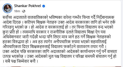 पोखरेलले सर्वोच्चले दिएको आदेश वालवालिकाको भविष्यका लागि भएको भन्दै भनेका छन्, ‘ सर्वोच्च अदालतले वालवालिकाको भविष्यका वारेमा गम्भीर चिन्ता गर्दै निर्देशनात्मक आदेश दिएछ । कतिपय शिक्षक नेताहरु उक्त आदेश सरकारका लागि हो भनेर तर्क गरिरहनु भएको छ । हो आदेश त सरकारलाई हो । तर चिन्ता विद्यालय वन्द भएको कुरा प्रति हो । त्यसमाथि सरकार र राजनीतिक दलले विद्यालय शिक्षा ऐन यस अधिवेशनवाट जारी गर्दछौ भन्दा पनि लिएर मात्र जाने हठ गर्ने शिक्षक नेताहरुको हठका विरुद्धमा हो ।’