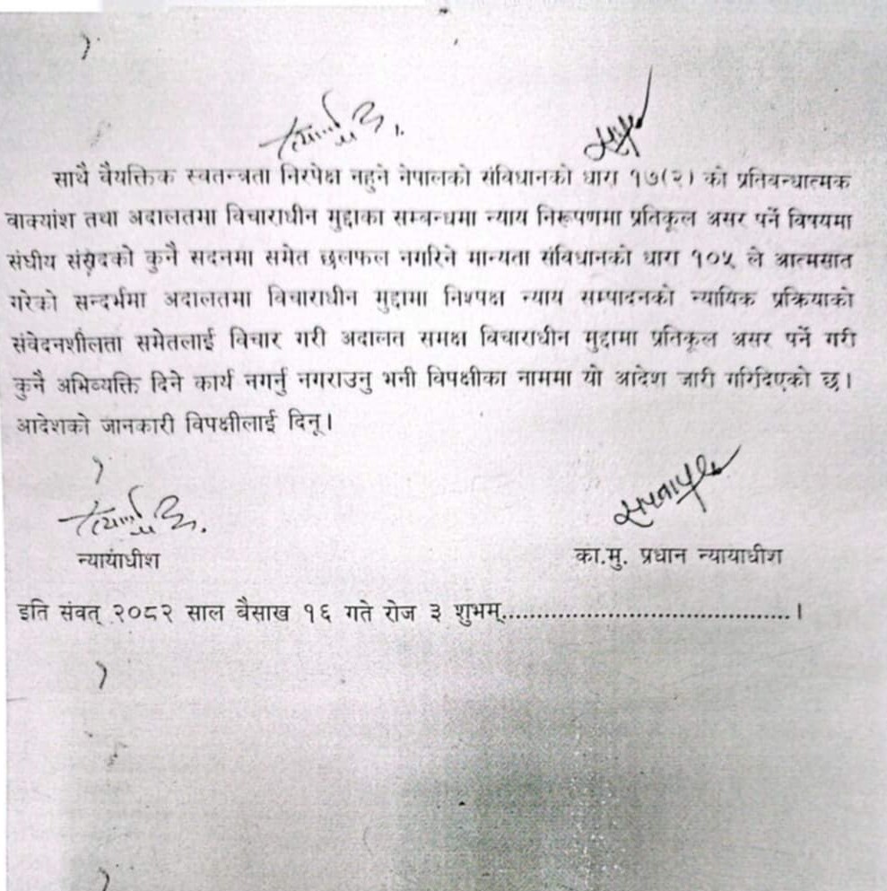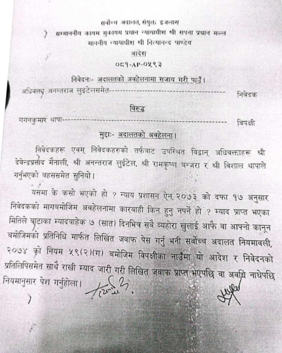 काठमाडौं । सर्वोच्च अदालतले नेपाली कांग्रेसका महामन्त्री गगनकुमार थापालाई अदालतको अवहेलना मुद्दामा लिखित जवाफ पेस गर्न आदेश दिएको छ । सर्वोच्चका कामु प्रधानन्यायाधीश सपना प्रधान मल्ल र न्यायाधीश नित्यानन्द पाण्डेयको संयुक्त इजलासले महामन्त्री थापासँग लिखित जवाफ पेस गर्न आदेश दिएको हो ।