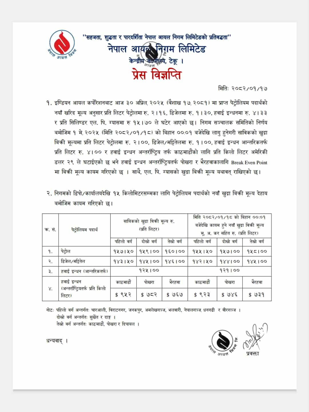 काठमाडौं । नेपाल आयल निगमले पेट्रोलियम पदार्थको मूल्य घटाएको छ । ईण्डियन आयल कर्पोरेशनबाट मूल्य घटेर आएपछि नेपालमा पनि भाउ घटेको निगमले विज्ञप्तिमार्फत जानकारी गराएको छ।