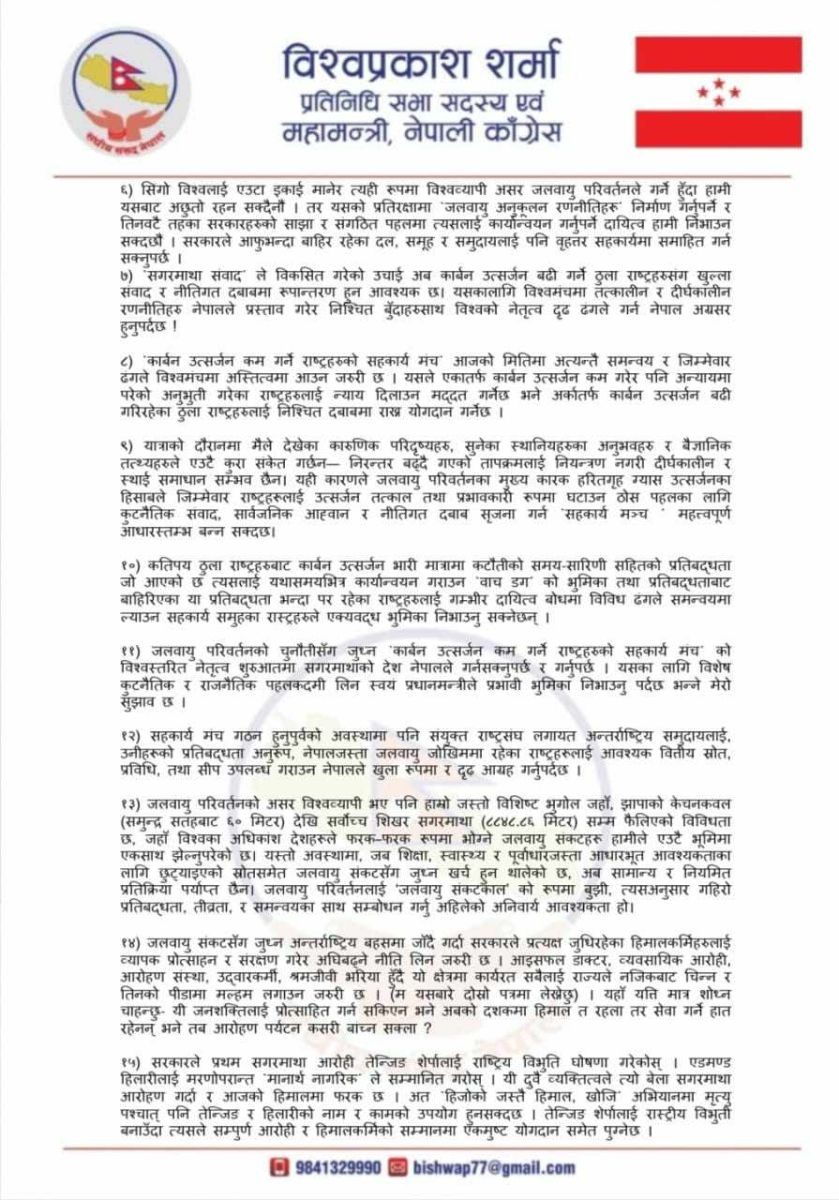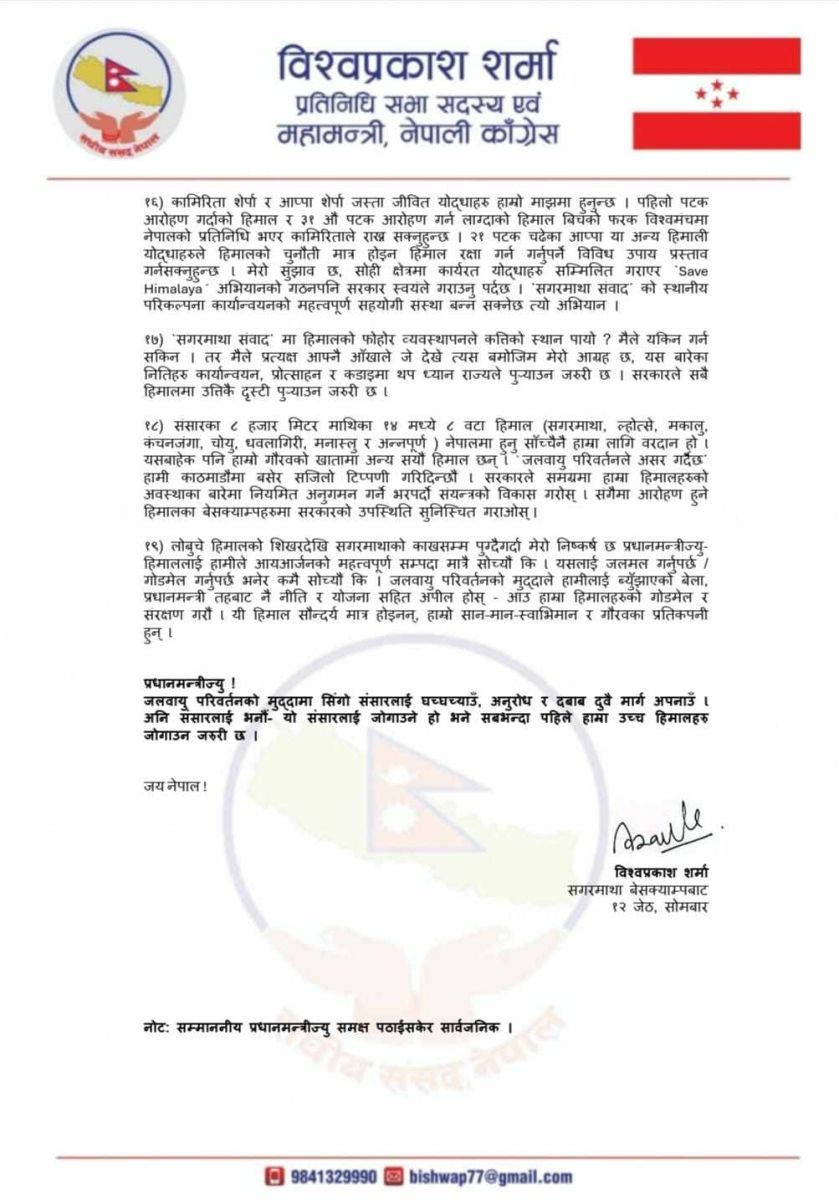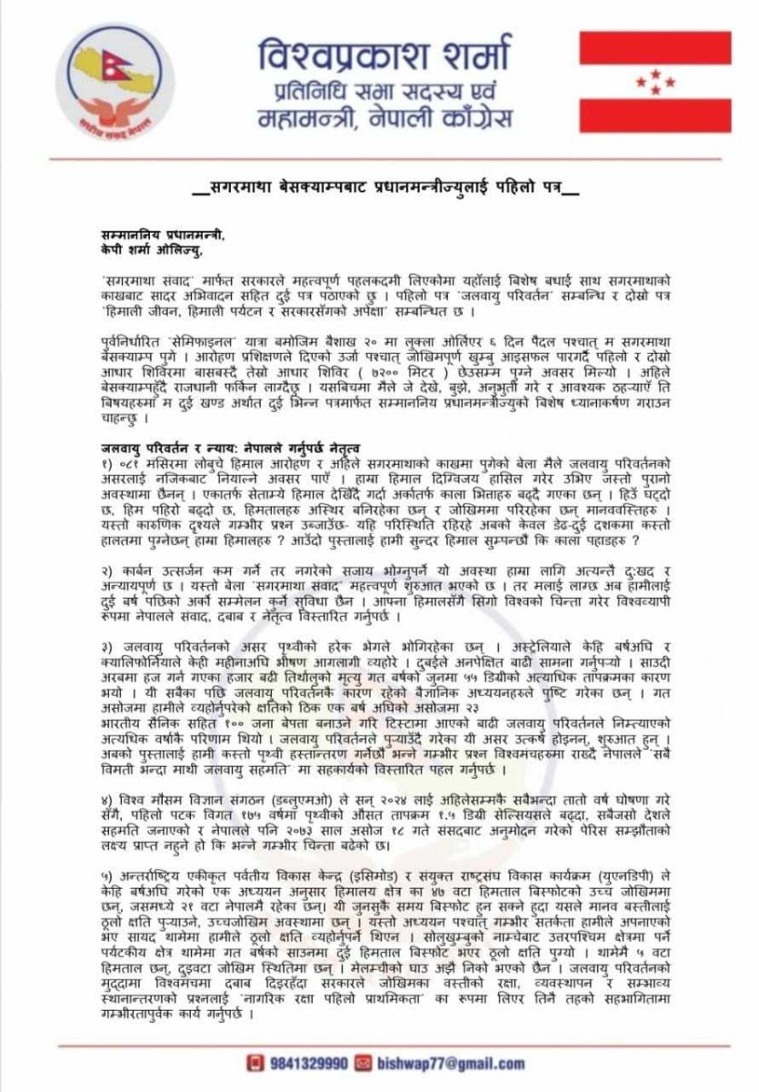 काठमाडौं । सगरमाथाको बेसक्याम्पबाट नेपाली कांग्रेसका महामन्त्री विश्वप्रकाश शर्माले प्रधानमन्त्री केपी शर्मा ओलीलाई पत्र पठाएका छन्।