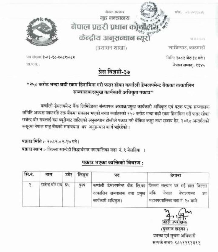 काठमाडौं । कर्णाली डेभलपमेन्ट बैंकका तत्कालीन सञ्चालक तथा प्रमुख कार्यकारी अधिकृत राजेन्द्र वीर राय पक्राउ परेका छन् ।