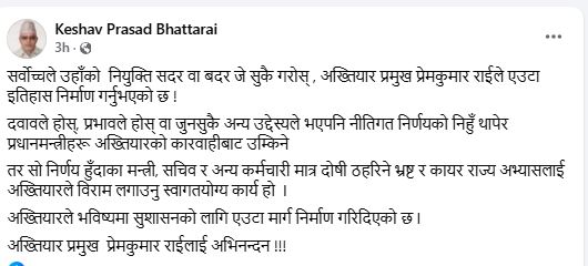 अख्तियारले सुशासनको जग बसाल्नका लागि बाटो निर्माण गर्न थालेको भन्दै सामाजिक सञ्जालबाट पछिल्लो समय राईको प्रसंसा गर्ने गरिएको छ ।