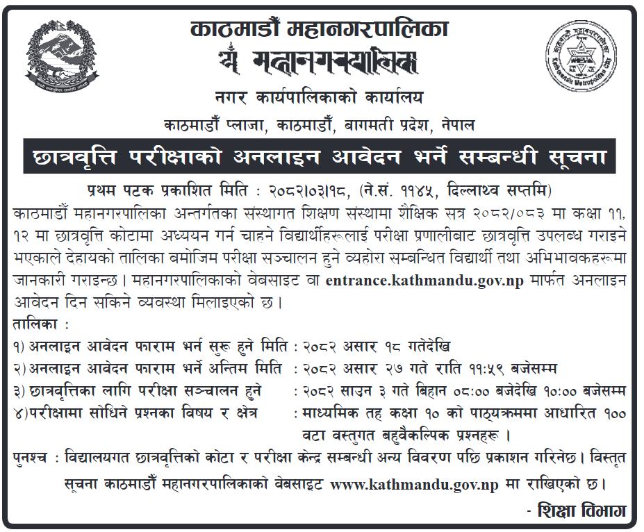 महानगरपालिका अन्तर्गत संस्थागत शिक्षण संस्थामा शैक्षिक सत्र २०८२/०८३ मा कक्षा ११ र १२ मा छात्रावृत्तिमा अध्यायन गर्ने विद्यार्थीहरुका लागि परिक्षा प्रणालीबाट योग्य विद्यार्थी छनोट गर्न इच्छुक विद्यार्थीहरुबाट आवेदन माग गरेको हो ।