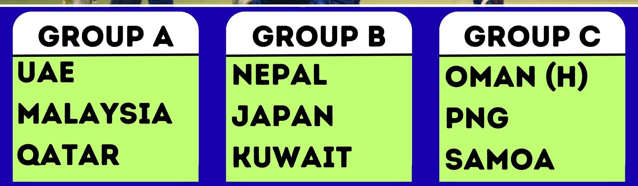 समूह १ मा युएई, मलेसिया र कतार छन्। समूह २ मा नेपाल, कुवेत र जापान छन् भने समूह ३ मा आयोजक ओमान, पपुवा न्यूगिनी र सामोआ रहेका छन्।