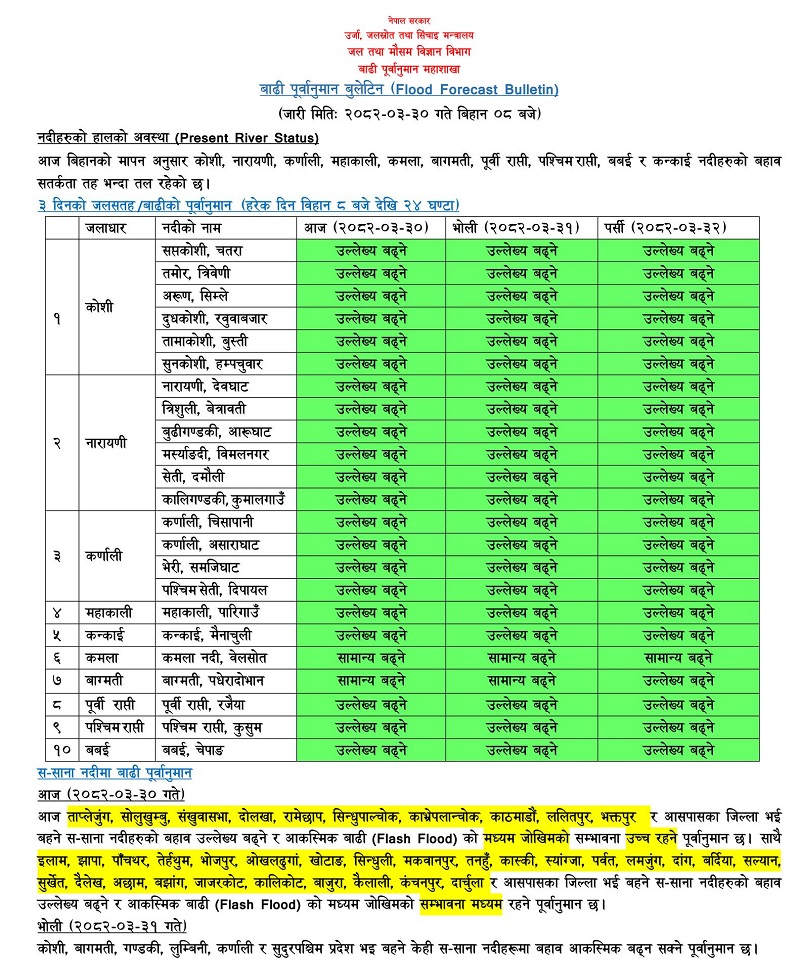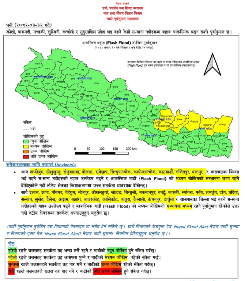 बाढीको जोखिम भएका तथा आसपासका जिल्ला भई बहने खोला तथा नदी तटीय क्षेत्रमा आवश्यक सतर्कता अपनाउन महाशाखाको अनुरोध छ ।