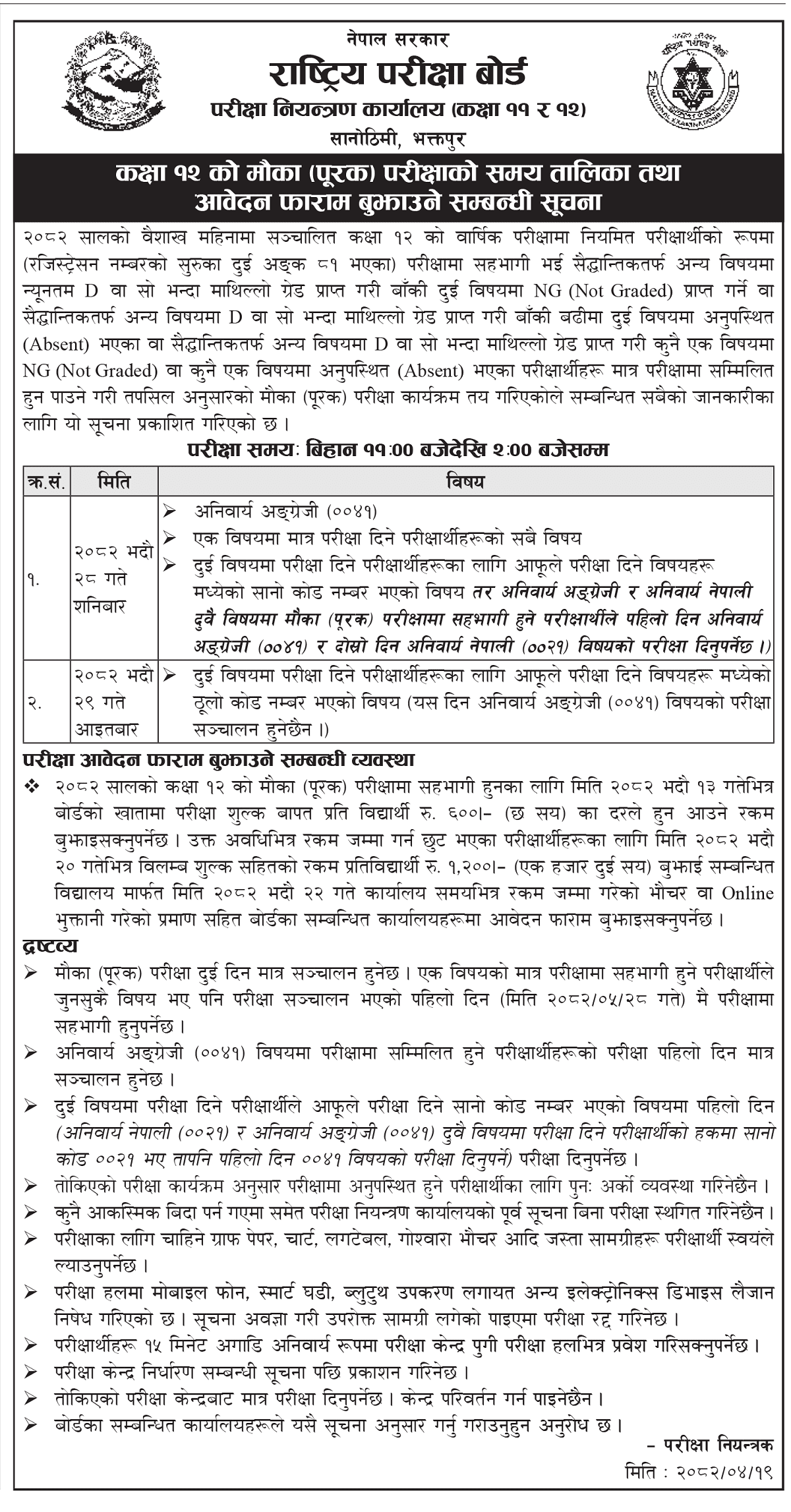 कक्षा १२ को पूरक परीक्षाको तालिका सार्वजनिक