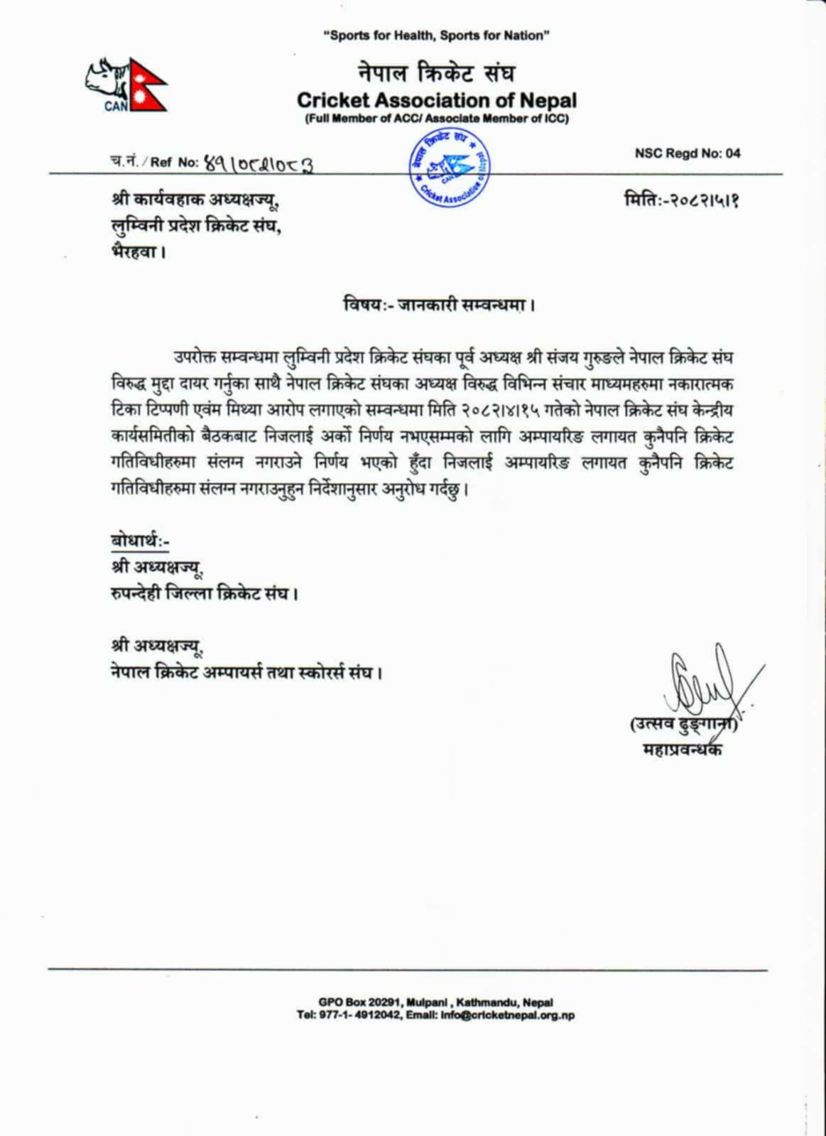 क्यानका महाप्रबन्धक उत्सव ढुङ्गानाको हस्ताक्षरमा पठाइएको पत्रमा ‘लुम्बिनी प्रदेश क्रिकेट सङ्घका पूर्व अध्यक्ष सञ्जय गुरुङले नेपाल क्रिकेट संघविरुद्ध मुद्दा दायर गर्नुका साथै सङ्घका अध्यक्षविरुद्ध विभिन्न सञ्चार माध्यमहरूमा नकारात्मक टिका टिप्पणी एवं मिथ्या आरोप लगाएको सम्बन्धमा मिति २०८२|४|१५ गतेको नेपाल क्रिकेट सङ्घ केन्द्रीय कार्यसमितिको बैठकबाट अम्पायरिङ लगायत कुनै पनि क्रिकेट गतिविधिहरूमा संलग्न नगराउने निर्णय भएको’ उल्लेख छ।