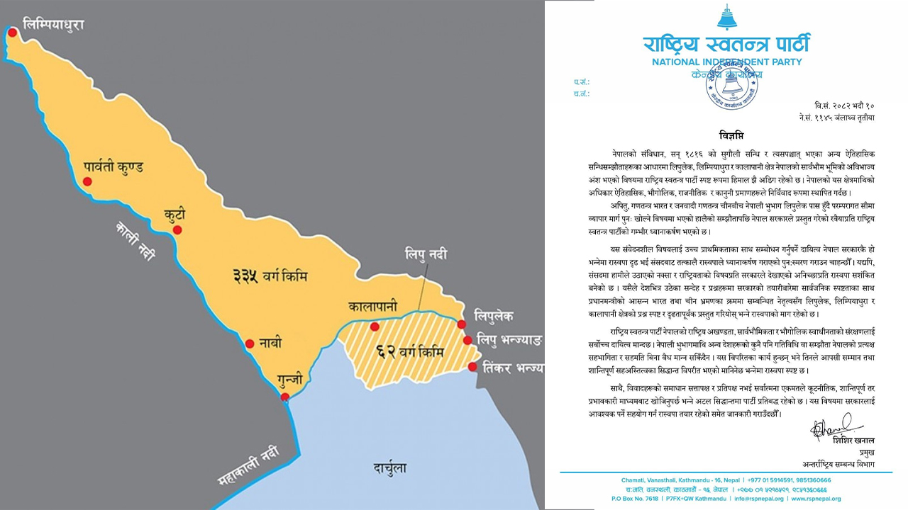 ‘यद्यपि, संसदमा हामीले उठाएको नक्सा र राष्ट्रियताको विषयप्रति सरकारले देखाएको अनिच्छाप्रति रास्वपा सशंकित बनेको छ,’ रास्वपाले भनेको छ, ‘यसैले देशभित्र उठेका सन्देह र प्रश्नहरूमा सरकारको तयारीबारेमा सार्वजनिक स्पष्टताका साथ प्रधानमन्त्रीको आसन्न भारत तथा चीन भ्रमणका क्रममा सम्बन्धित नेतृत्वसँग लिपुलेक, लिम्पियाधुरा र कालापानी क्षेत्रको प्रश्न स्पष्ट र दृढतापूर्वक प्रस्तुत गरियोस् भन्ने रास्वपाको माग रहेको छ।’