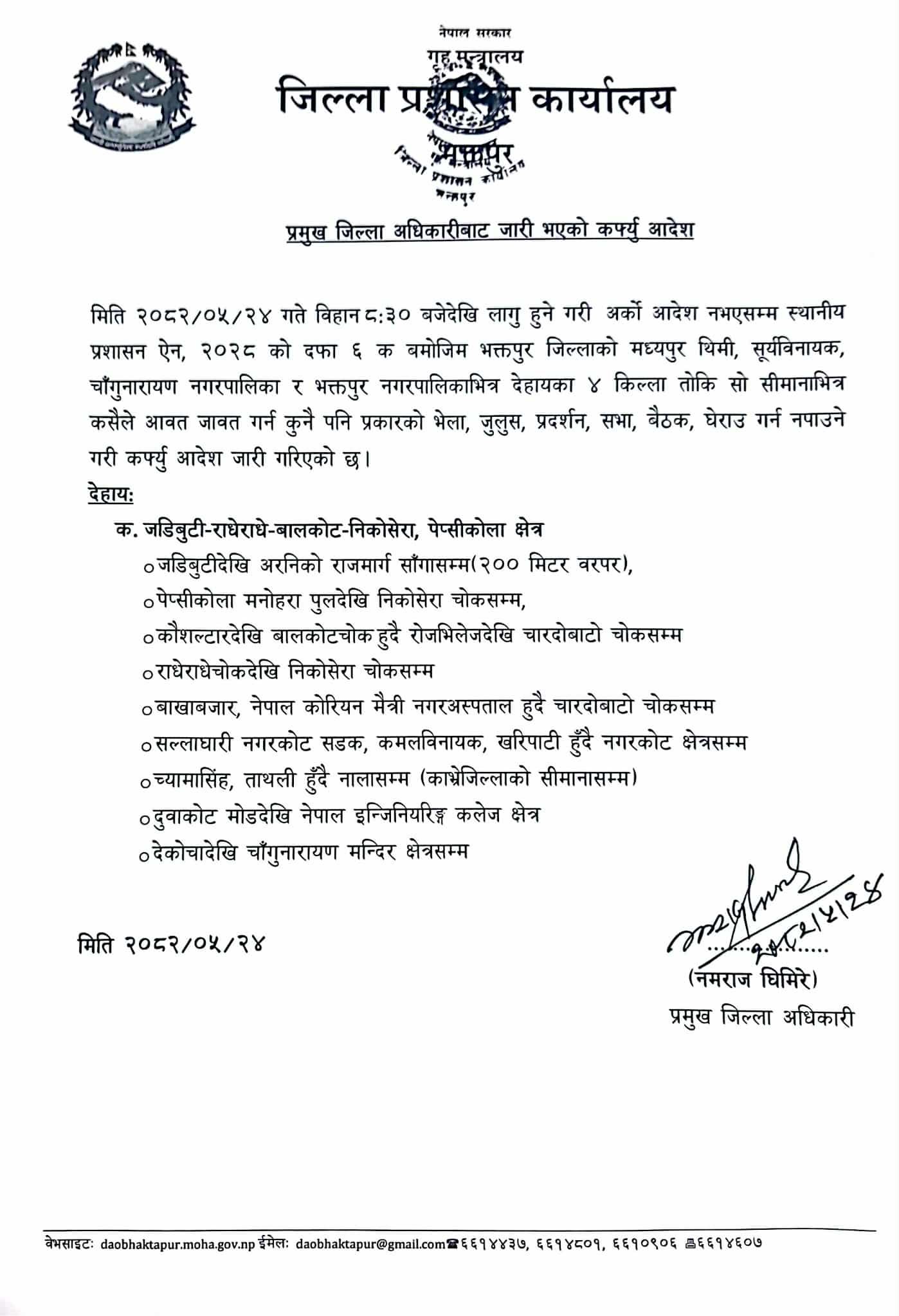 काठमाडौं । जिल्ला प्रशासन कार्यालय भक्तपुरले आज बिहान ८ः३० बजेदेखि लागु हुने गरेर अनिश्चितकालका लागि जिल्ला भरि कर्फ्यु आदेश जारी गरेको छ।