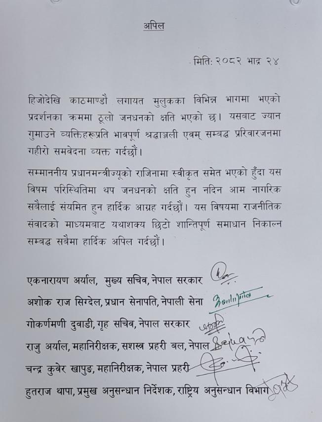 सार्वजनिक अपिलमा हस्ताक्षर गर्ने उच्च अधिकारीहरूमा मुख्य सचिव एकनारायण अर्याल, प्रधान सेनापति अशोकराज सिन्देल, गृह सचिव गोकर्णमणि डुवाडी, नेपाल प्रहरीका महानिरीक्षक चन्द्रकुवेर खापुङ, सशस्त्र प्रहरी बलका महानिरीक्षक राजु अर्याल र राष्ट्रिय अनुसन्धान विभागका महानिर्देशक हुतराज थापा छन्।