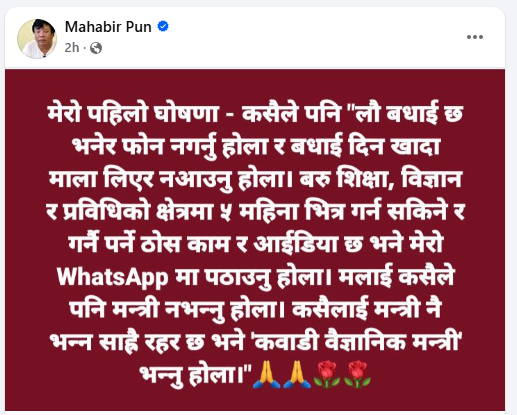 उनले सामाजिक सञ्जाल फेसबुकमा पहिलो घोषणा भन्दै लेखेका छन्, ‘मलाई मन्त्री नभन्नुहोला । कसैलाई मन्त्री भन्न साह्रै रहर छ भने कबाडी वैज्ञानिक मन्त्री भन्नुहोला ।’