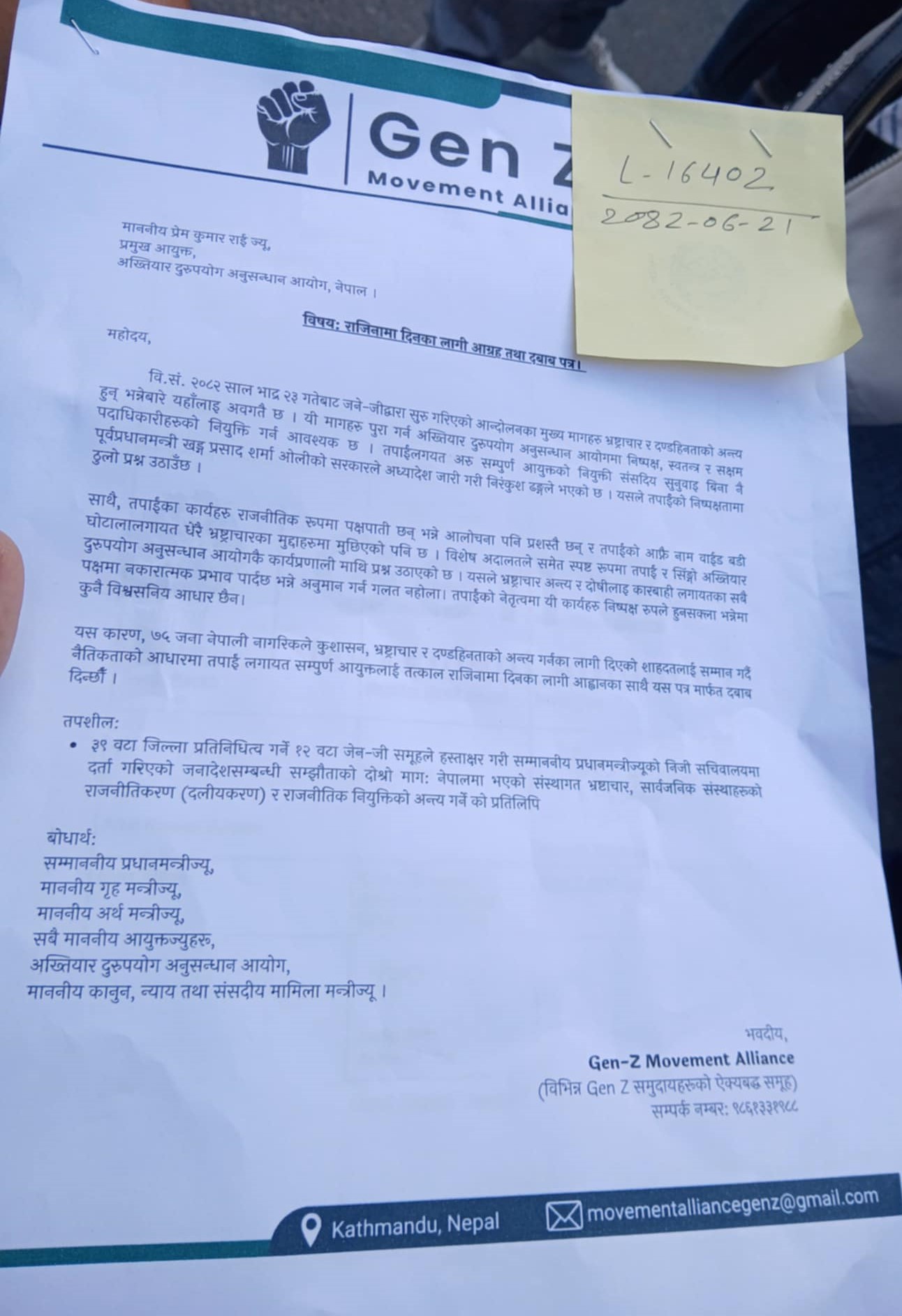 उनीहरूले जेनजी मोमेन्ट एलाइन्सका केही युवाहरू अजित खनाल उर्जा, रिजन राना मगर, पेमा बाङ्बो लामा र मोनिका लगायतलाई उपयोग गरि अख्तियारका प्रमुख आयुक्त प्रेम कुमार राई र अन्य आयुक्तको राजिनामा माग्दै आज असोज २१ गते बिहान अख्तियारमा निवेदन दर्ता गराएका छन।