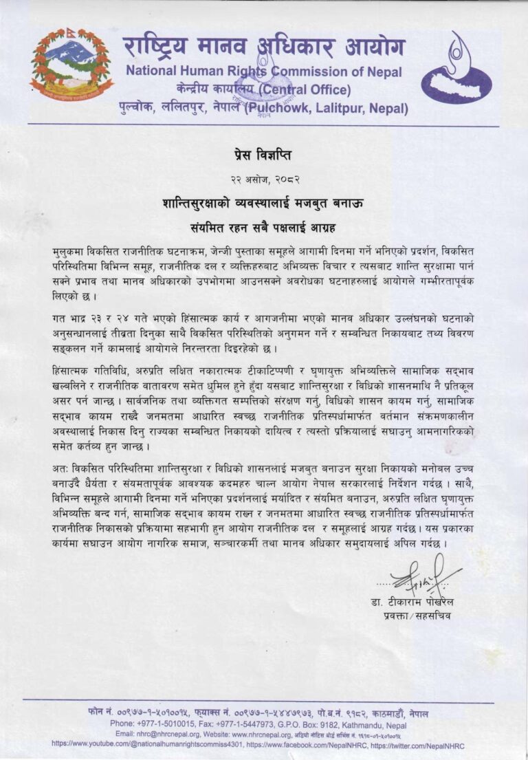 आयोगका प्रवक्ता तथा सहसचिव डा. टीकाराम पोखरेलद्वारा जारी विज्ञप्तिमा राजनीतिक दल, व्यक्ति तथा विभिन्न समूहहरुबाट अभिव्यक्त विचार र त्यसबाट शान्ति सुरक्षामा पर्नसक्ने प्रभावप्रति चिन्ता व्यक्त गर्दै सरकारलाई संयमतापूर्वक आवश्यक कदम चाल्न निर्देशन दिएको छ ।