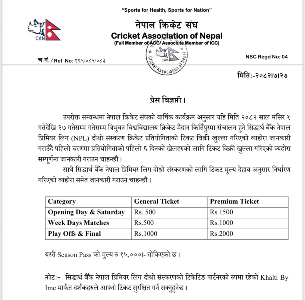 यस्तै, अन्य दिनमा खेल हुँदा सामान्यतर्फ ५०० र प्रिमियममा एक हजार रुपैयाँ तिर्नुपर्ने हुन्छ । यसैगरी प्लेअफ र फाइनलका निम्ति भने सामान्यतर्फ नै एक हजार र प्रिमियमतर्फ दुई हजार रुपैयाँ टिकट मूल्य तोकिएको छ ।