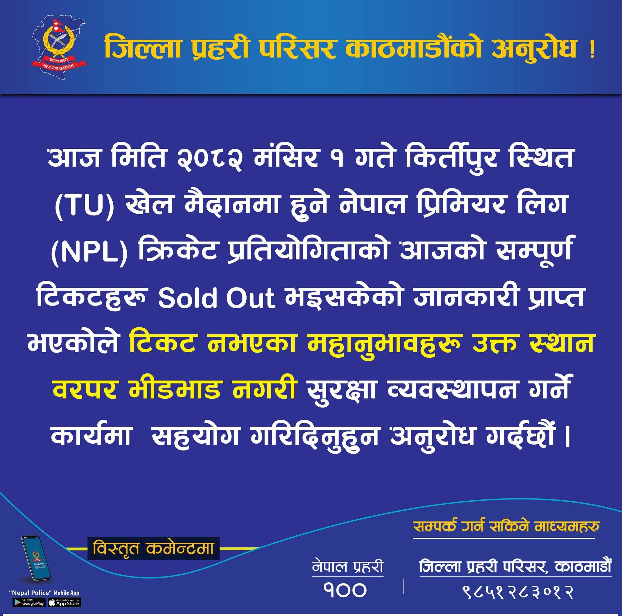 आज मंसिर १ गते सोमबार एक सूचना सार्वजनिक गर्दै प्रहरीले आजको खेलका लागि टिकट पूर्णरूपमा सोल्ड–आउट भएको सूचना प्राप्त भएसँगै प्रहरीले टिकट नभएकालाई खेलमैदान क्षेत्र वरपर भीडभाड नगर्न आग्रह गरेको हो ।