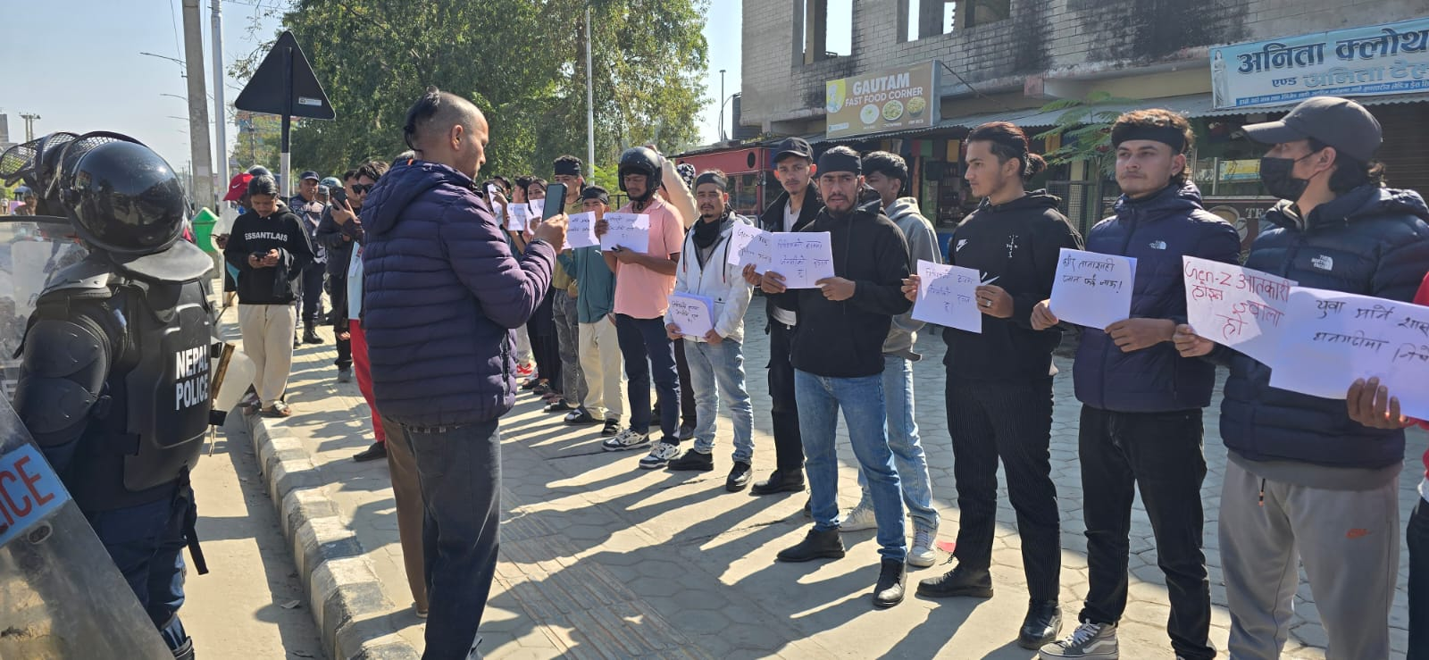 बुधबार बिहान कैलालीको धनगढी बजारमा जेनजी युवाहरूले प्लाकार्डसहित विरोध प्रदर्शन गरेका हुन् । राष्ट्रिय युवा संघले आयोजना गरेको युवा जागरण अभियानलाई सम्बोधन गर्न बस्नेत धनगढी जाँदै छन् । बस्नेतको विरोधमा धनगढीको जेन–जी मार्गनजिक हसनपुरमा युवाहरूको समूहले प्लेकार्डसहित प्रदर्शन गरिरहेका छन् ।