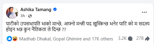 तामाङले लेखेकि छन्, “पार्टीको उपसभापति भाको मान्छे, आफ्नो मन्त्री पद खुस्किन्छ भनेर पार्टीको म सदस्य होइन भन्न कुन नैतिकताले दिन्छ ?” उनका अनुसार यस्तो अभिव्यक्तिले राजनीतिक जिम्मेवारी र आचरणमाथि गम्भीर प्रश्न खडा गर्छ।
