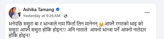तामाङले लेखेकी छन्, “भनेपछि ससुरा बा र भान्जाले नाम फिर्ता लिन मानेनन्। आफ्नै रगतको भाइको ससुरा आफ्नै ससुरा हो कि होइन ? अनि नाताले आफ्नो भान्जा पर्ने व्यक्ति आफ्नो नातेदार हो कि होइन ?”