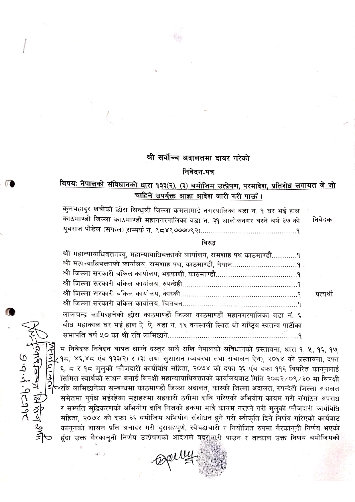 काठमाडौं । राष्ट्रिय स्वतन्त्र पार्टी (रास्वपा) का सभापति रवि लामिछानेविरुद्धको सम्पत्ति शुद्धीकरण र संगठित अपराधसम्बन्धी अभियोग फिर्ता लिने महान्यायाधिवक्ता कार्यालयको निर्णयविरुद्ध सर्वोच्च अदालतमा रिट निवेदन दायर गरिएको छ।