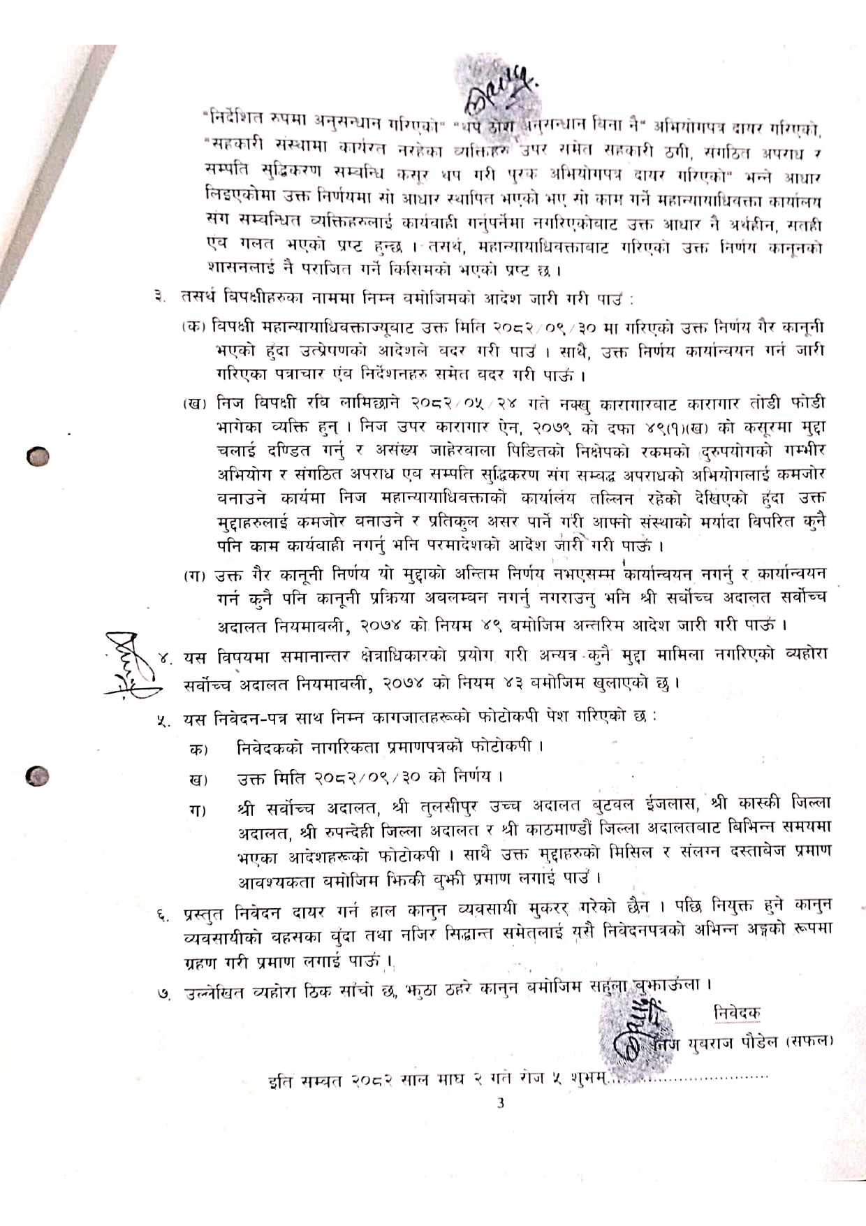 शुक्रबार युवराज सफलले उक्त निर्णय बदरको माग गर्दै सर्वोच्च अदालतमा रिट पेस गरेका हुन्। रिट दायर गरेपछि सफलले भने, “रिट पेस गरेको छु। सर्वोच्च प्रशासनले अध्ययन गरिरहेको छ।” गत पुस ३० गते महान्यायाधिवक्ता सबिता भण्डारीले रवि लामिछानेमाथि लागेको सम्पत्ति शुद्धीकरण तथा संगठित अपराधसम्बन्धी मुद्दा फिर्ता लिन स्वीकृति दिएकी थिइन्।