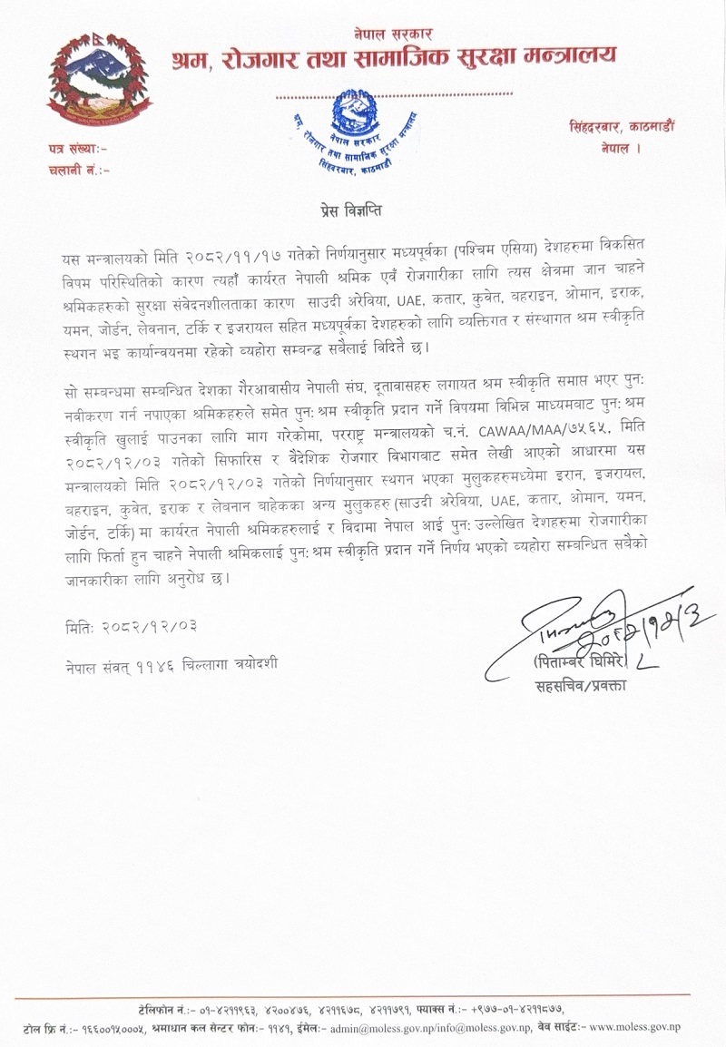 पहिलेदेखि कार्यरत नेपाली श्रमिक पुनः श्रम स्वीकृति दिने निर्णयले केही राहत भएको छ । मध्यपूर्वमा विकसित युद्धका कारण यसअघि गएको फागुन १७ गतेदेखि ती देशको श्रम नवीकरण रोकिएको थियो । पछिल्लो समय ती देशमा देखिएको अस्थिर अवस्था, सुरक्षा जोखिम तथा अनिश्चितताको कारण यस्तो निर्णय गरिएको श्रम, रोजगार तथा सामाजिक सुरक्षा मन्त्रालयले जनाएको छ ।